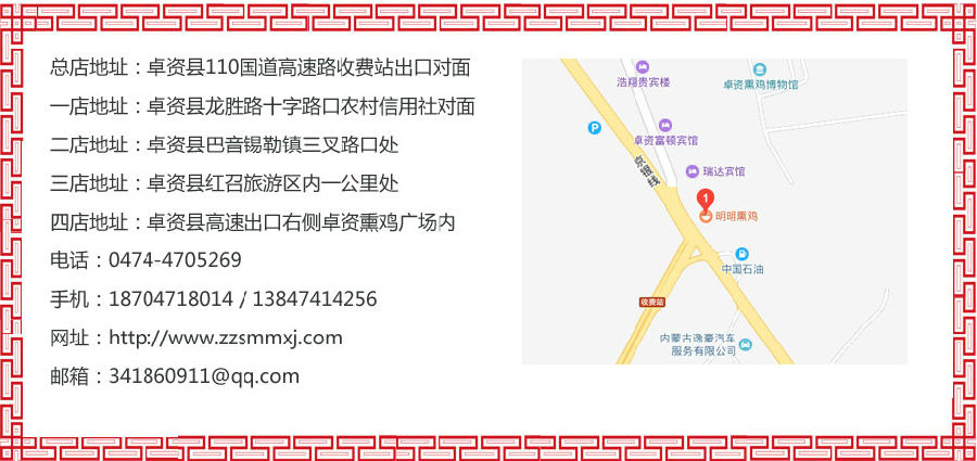 四店地址:卓資縣高速出口右側(cè)卓資熏雞廣場內(nèi)